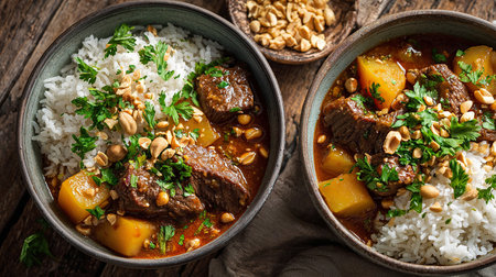 Two bowls of massaman curry with beef, potatoes, rice, and peanuts served in bowls top view, traditional Thai cuisine