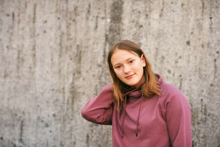 Outdoor urban portrait of young teen girl posing against grey wall, wearing pink sweatshirt