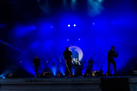 Kiel, Germany - June 26th 2019: The Hip-hop-Band Antilopen Gang is performing on the Rathaus Stage during the 125th Kiel Week