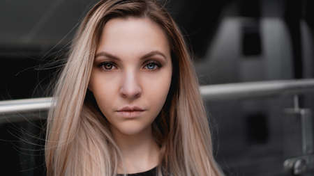 Urban style blonde girl with a stern look. Girl power. Real different eyes color.