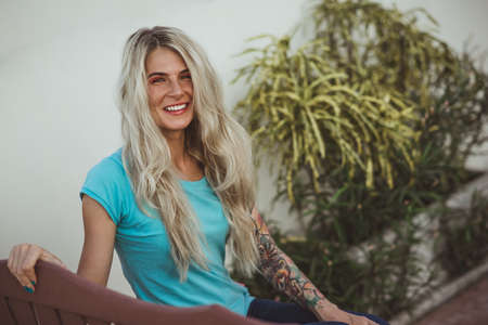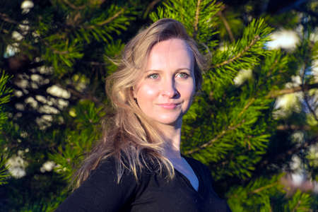 Blonde woman standing near the tree in the city park in the summer , portrait