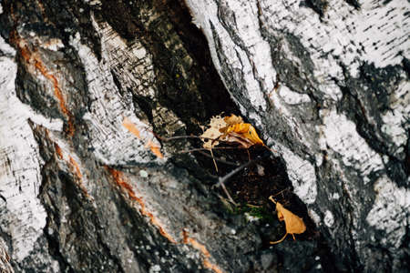Autumn orange yellow leaves in birch bark close-up. White nature background. Plane of birch trunk surface. Tree textured backdrop. Detailed natural texture of birch tree stem. Abstract background.