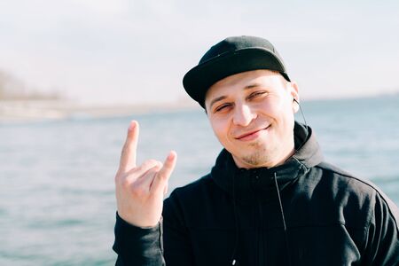 Smiling teen boy 16-18 year old wearing black knitted hat, hoodie and denim jacket outdoors at sun set on background. Looking at camera. Teenagerhood.