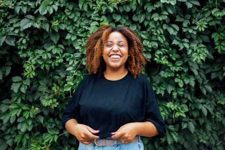 Young positive african woman smiling outside with a ivy plant in the background at street of city wearing on black blouse and blue jeans. Calm and nature in the city concept