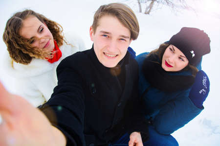 a group of friends do selfie in the winter in a clearing