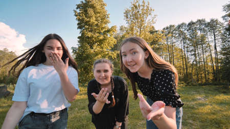 Girls blow a kiss at a picnic near the forest.