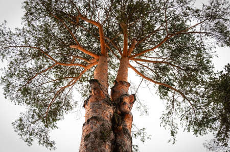 Peaks of two pine trees isolated veiw from bottom