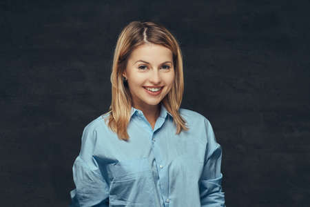 Portrait of a smiling sensual blonde girl dressed in a blue shirt, posing in a studio.