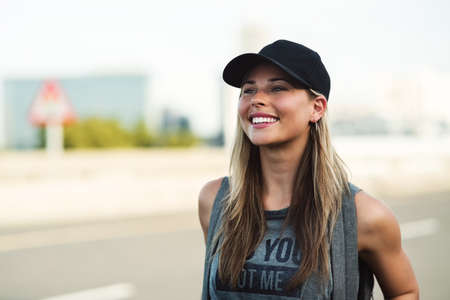 Portrait of fitness young woman in rainy city