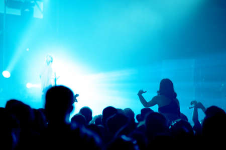 Rear view of crowd with arms outstretched at concert. Bright stage lights in the background