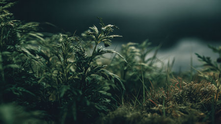 Captivating close-up of lush green foliage on the forest floor, illuminated by soft light, creating a serene and tranquil atmosphere perfect for nature-themed projects.