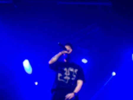 Blurred vocalist man, singer holding microphone and singing a song on stage with blue light on dark background. Blurry music performance in rock band concert.