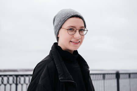 Portrait of a smiling young woman with short hair in hat, eyeglasses, black coat standing on a city street looking at camera. Enjoying weather and having fun. Candid people