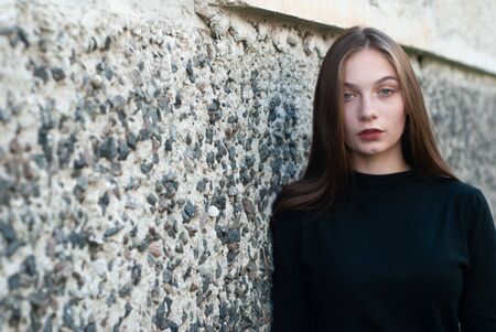 Beautiful young girl in a black turtleneck sweater posing in the concrete wall,