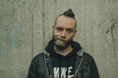serious looking bearded man looks into the camera