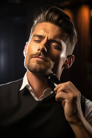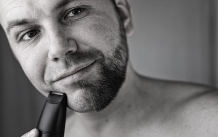 A young man shaving and trimming his beard with an electric razor, in the bathroom at home, early in the morning, to be groomed before going out