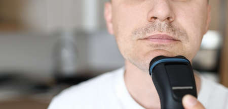 A middle-aged man shaves his face with an electric razor. Body care. Everyday routine. Shaving.