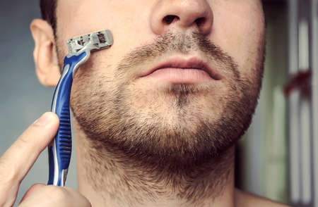 Young man shaving his beard with a razor, close up on the background of the bathroom
