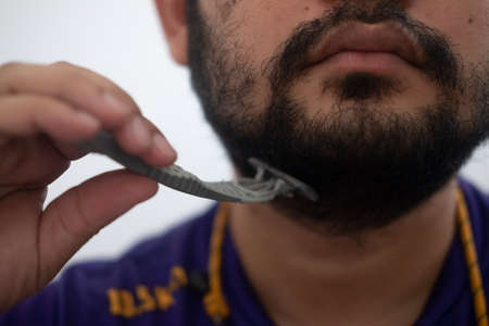 Young Indian man comb his beard and moustache on white background. Man is dressed in stripped t-shirt. Daylight