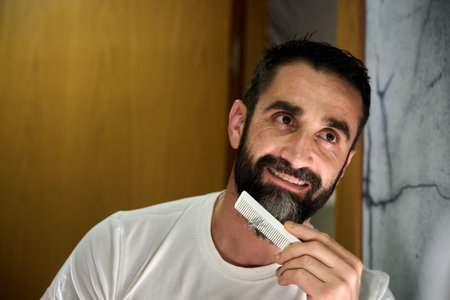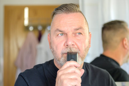 Bearded man looking at himself in mirror trimmng, shaving his beard using electric timmer razor.