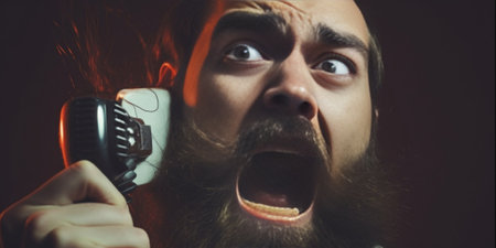 An adult man shaves himself with an electric razor. Unusual portrait of a bearded man with gray hair. Grimaces in front of the camera
