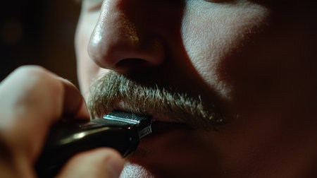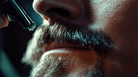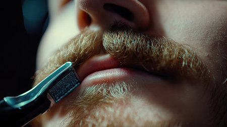 Trimming the mustache in a barbershop. Details of trimming. Cropped closeup of a barber trimming beard.