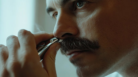 Thoughtful senior man holding a trimmer to his mustache looking aside with a pensive expression in close up