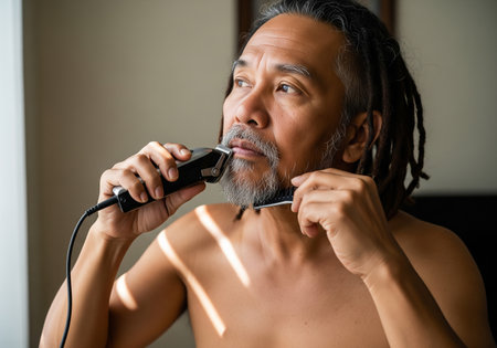 bald and bearded senior man is using electric razor to shave his neck and trim beard, grooming and self care for men concept