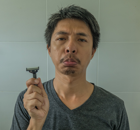 Half face of Asian handsome men are shave and beard in the washroom in front of the mirror