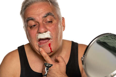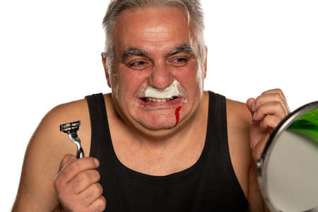 old man shaver gray-haired beard blue disposable razor in studio white background.