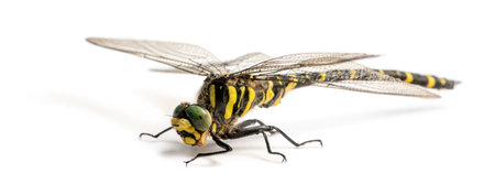Flying Cordulegaster bidentata viewed from below, isolated on white