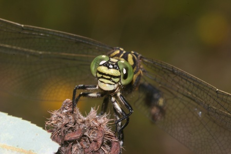 A Common flangetail dragonfly, Ictinogomphus decorates, on a branch.