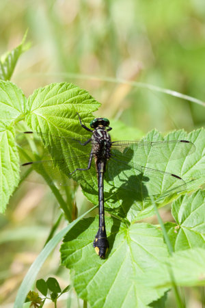 With its wings spread open a clubtail dragonfly rests on a green leaf