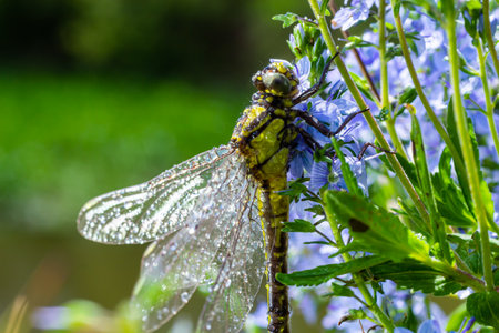 Dragonfly Gomphus vulgatissimus in front of green background macro shot with dew. on the wings. Blue flowers in the morning of a sunny summer day.