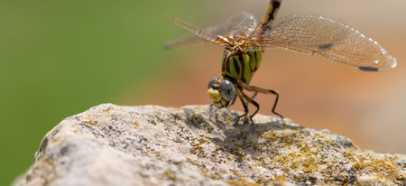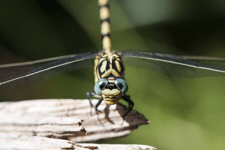 Onychogomphus forcipatus the small pincertail or green-eyed hook-tailed dragonfly insect of large size and striking yellow black and blue eyes perched by the riverbank intense daylight