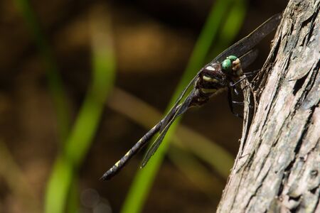 Unicorn Clubtail dragonfly Arigomphus villosipes resting on a log by a lake in Maryland during the Summer