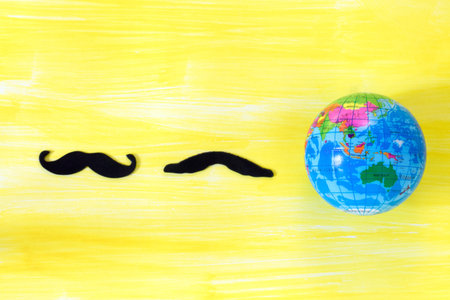 black mustache and world on yellow background empty copy space for inscription.