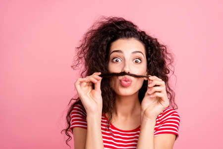 brunette woman with curls making fake mustache from hair isolated on yellow