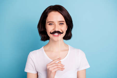 Close-up portrait of her she nice attractive lovely winsome cheerful cheery, funky girl showing fake mustache isolated on bright vivid shine vibrant blue turquoise color background