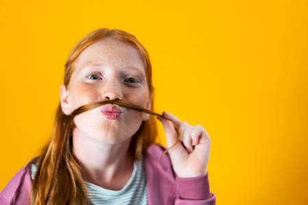 A young white red-haired girl with freckles uses her hair as a mustache. Concept of gender equality and woman empowerment. Strong, independent ginger Caucasian female preteen posing for a fun portrait
