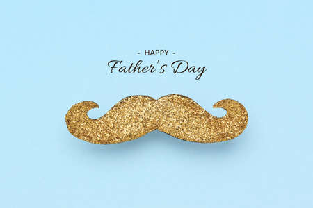 Happy Fathers Day greeting card, gold mustache on blue background, minimal.