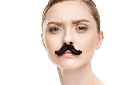 beautiful young woman with black mustaches looking at camera