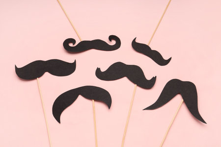 Black mustache paper, studio shot isolated on pink background, Prostate cancer awareness month, Fathers day, minimal November moustache concept