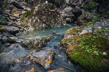 Scenic nature background of turquoise clear water stream among rocks with mosses, lichens and wild flora. Atmospheric mountain landscape with transparent mountain creek. Beautiful mountain stream.