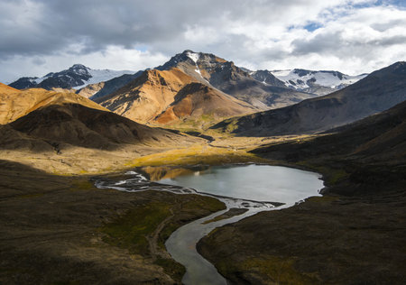 Atmospheric alpine landscape to glacial lake in highland valley. View from stony slope to big snowy mountains with glacier above mountain lake. Thick low clouds among rockies. Wonderful scenery.