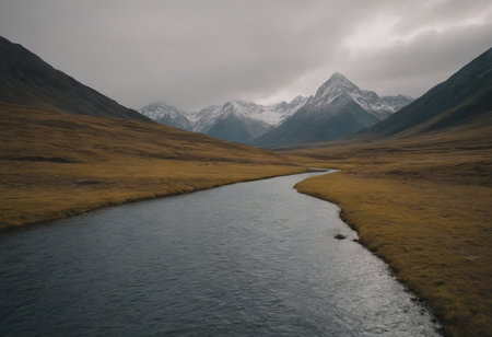 Golden hues intersperse with rich purples as the tundra awakens in autumn. The mountains stand tall against a clear sky, framing a winding river that glimmers in the soft light.