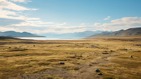 a grass-covered field with rocks, resembling desolate landscapes, showcases a mix of light brown and aquamarine hues. this captivating photo captures the essence of both the northern and southern dynasties, reminiscent of the impressive panoramas painted by martiros saryan. shot with a sony fe 35mm f/1.4 za lens, the image exudes a sense of tranquility and natural beauty. ai generated