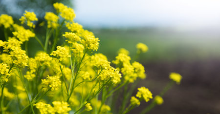 Barbarea arcuata or bittercress or herb barbara or wound rocket many yellow flowers background selective focus
