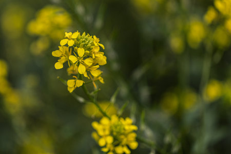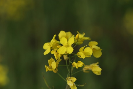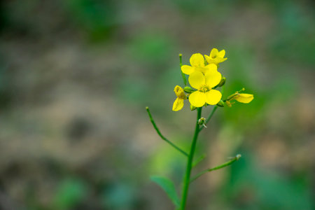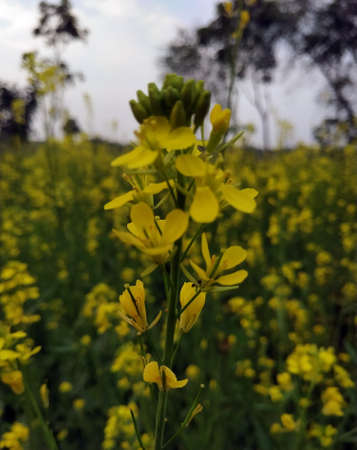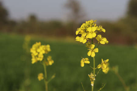 Close view if a mustard branch or mustard flower with a soft blurry background