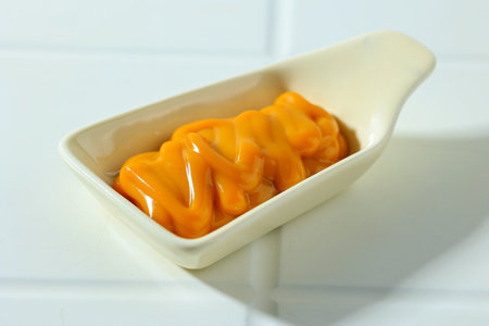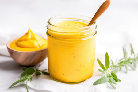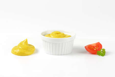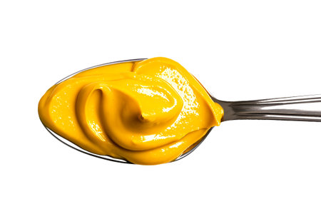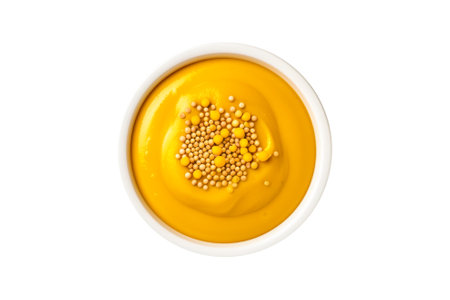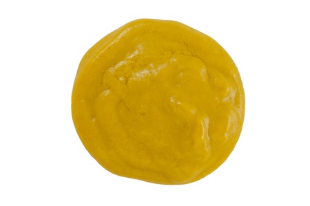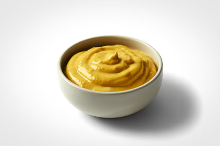 Close up image of mustard sauce against white background